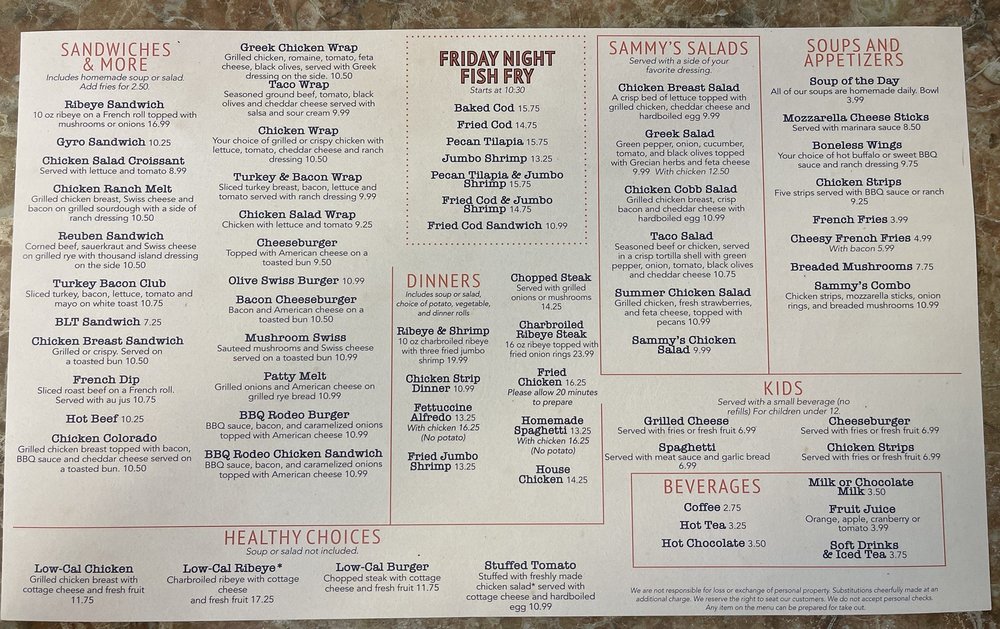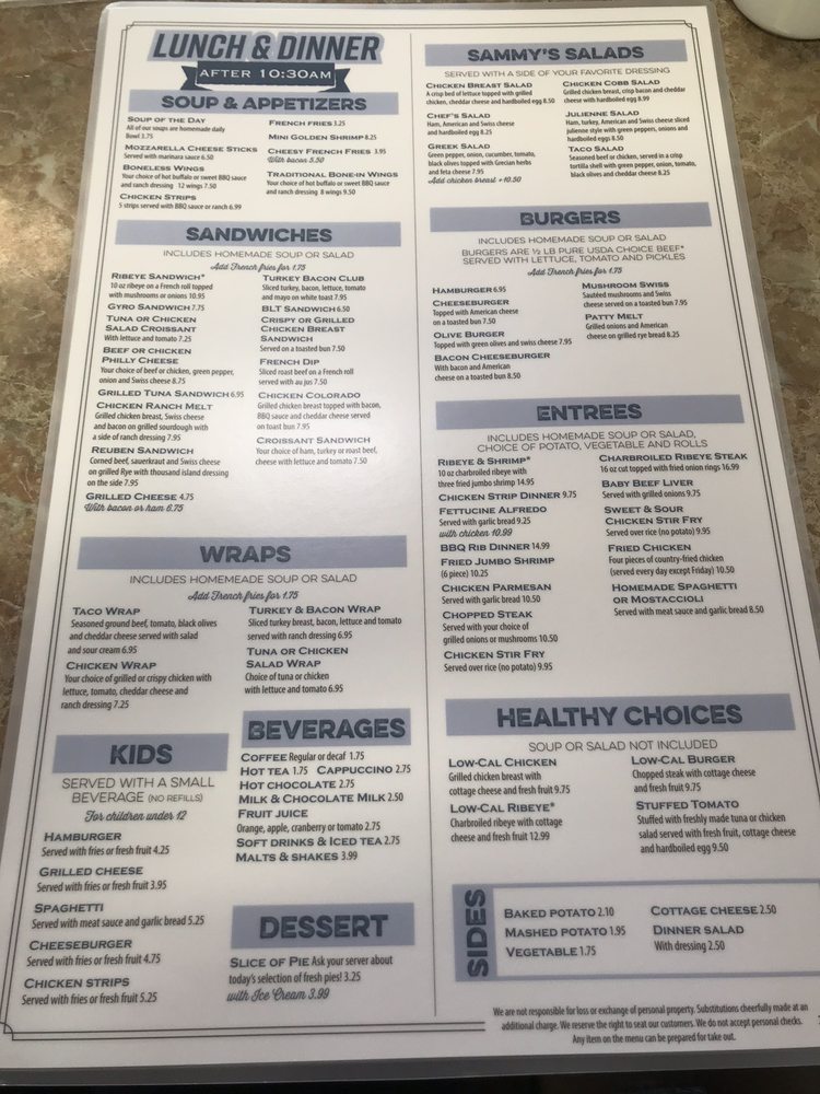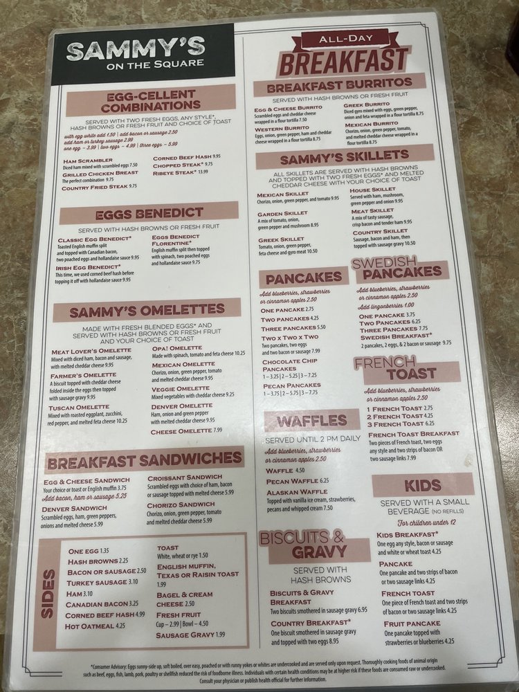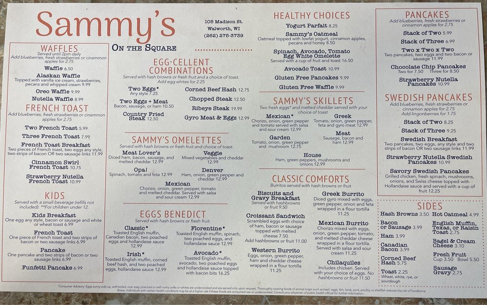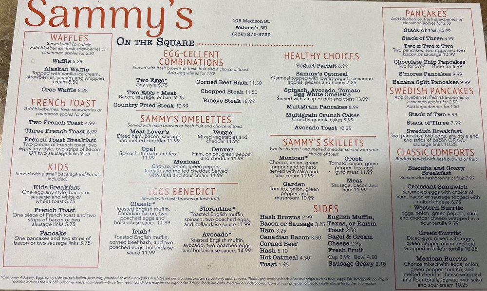 Introducing Sammy's on the Square, a delightful breakfast and brunch spot in Walworth, WI. With a wide array of menu options, including vegetarian choices, this restaurant offers a casual dining experience perfect for families and groups. The friendly staff provides excellent service, making every visit a pleasant one. Customers rave about the delicious food, with dishes like strawberry nutella french toast, country fried steak, and clam chowder standing out as favorites. The atmosphere at Sammy's is welcoming and clean, adding to the overall dining experience. Whether you're looking for a tasty breakfast, lunch, or dinner, Sammy's on the Square is a top choice for quality food and great service. Don't miss out on trying the sprinkle pancakes and cream of chicken rice soup – they come highly recommended by satisfied customers.